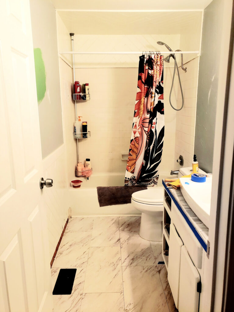 Here is a picture of the bathroom before installing the solo-tube, and I had started taping off the tile and sampling paint colors on the wall. With no natural light it always kind of looked yellow-ish and dim.