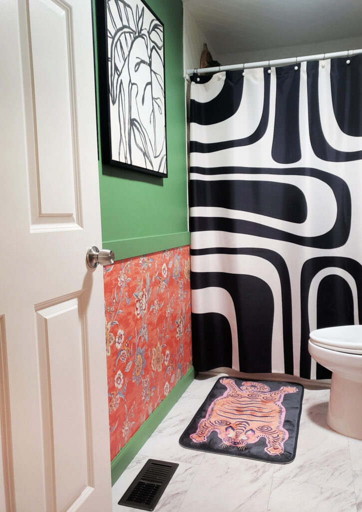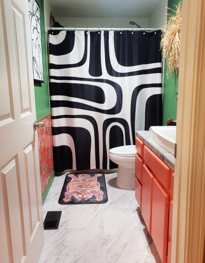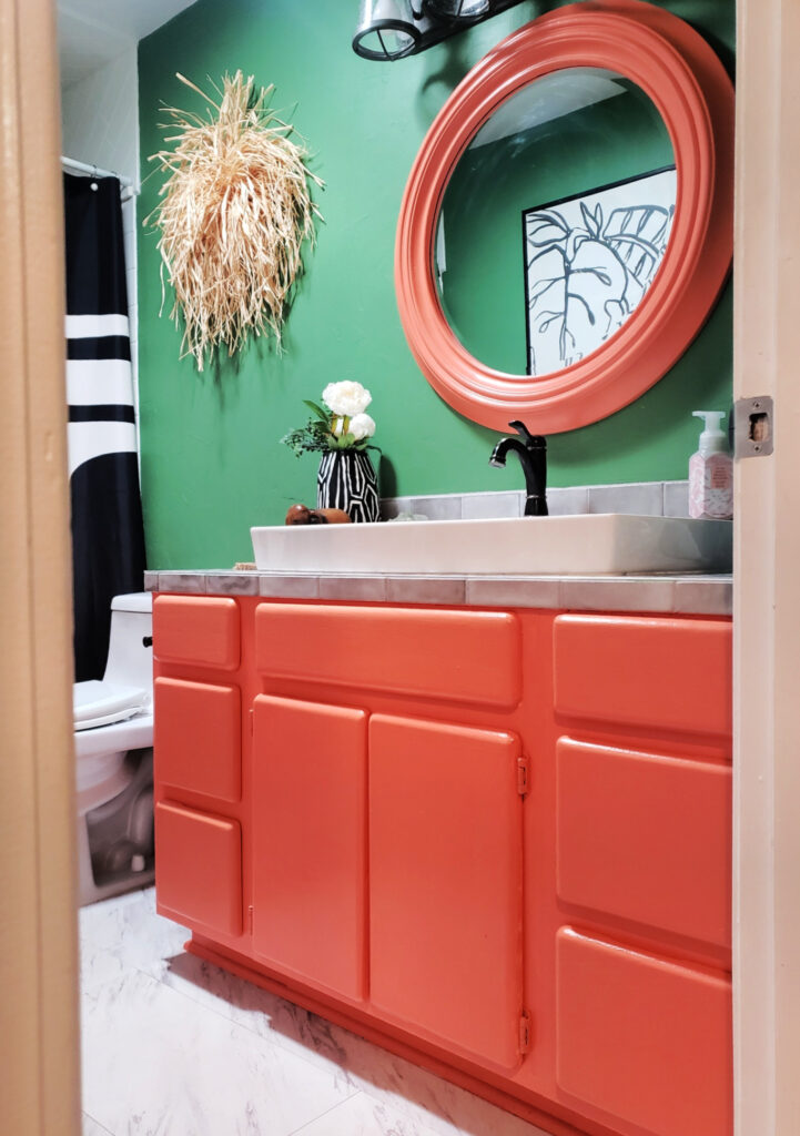 I went with a semi-gloss on the mirror and vanity in a fun bright coral color and I love how it goes with the shower curtain and wallpaper on the opposite wall.