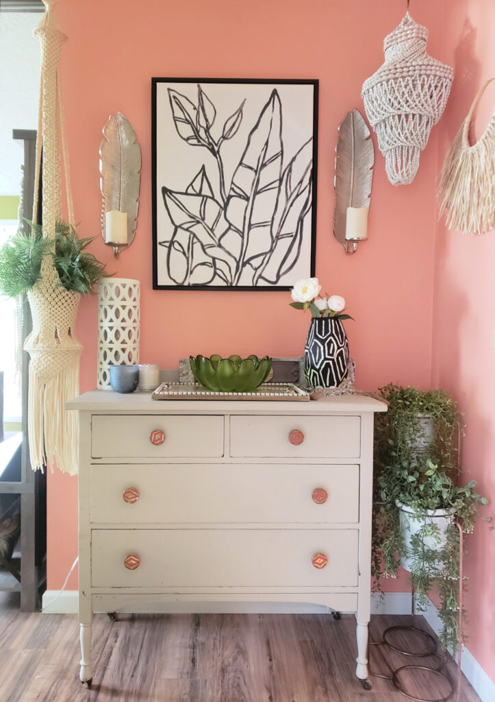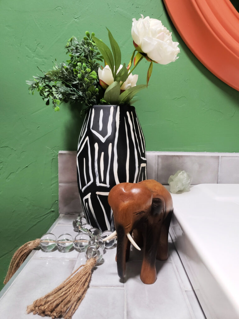 The wooden elephant a thrifted find, lucite chucky beads from Hobby Lobby, and the vase I painted myself, you can find the tutorial here.