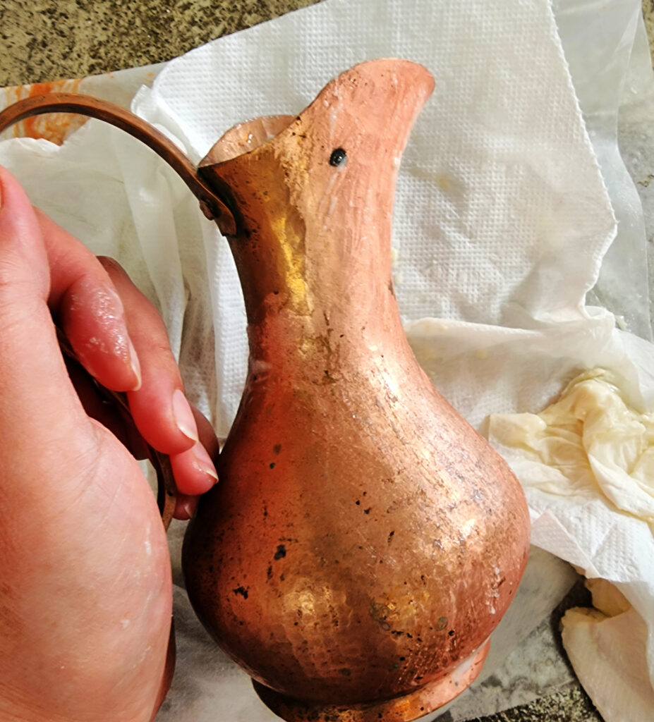 I’ve read multiple methods on how to clean copper, so I decided to try the ketchup method first. It took off some of the build up but I could tell I needed something with more acid.