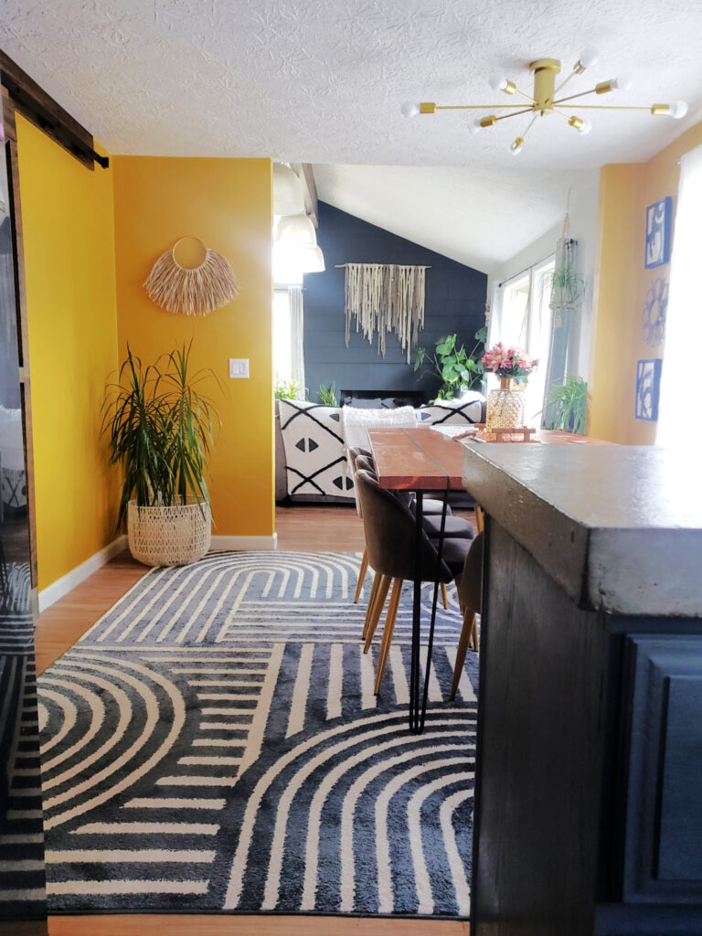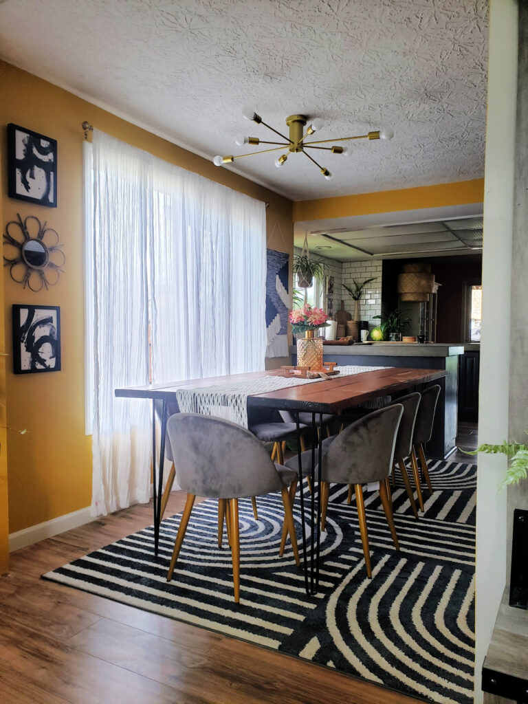 We chose these velvet dining chairs in a light grey from Amazon and this rug from Amazon too. I tried painting our old chairs but when the walls were done and the rug came in they just did not work.