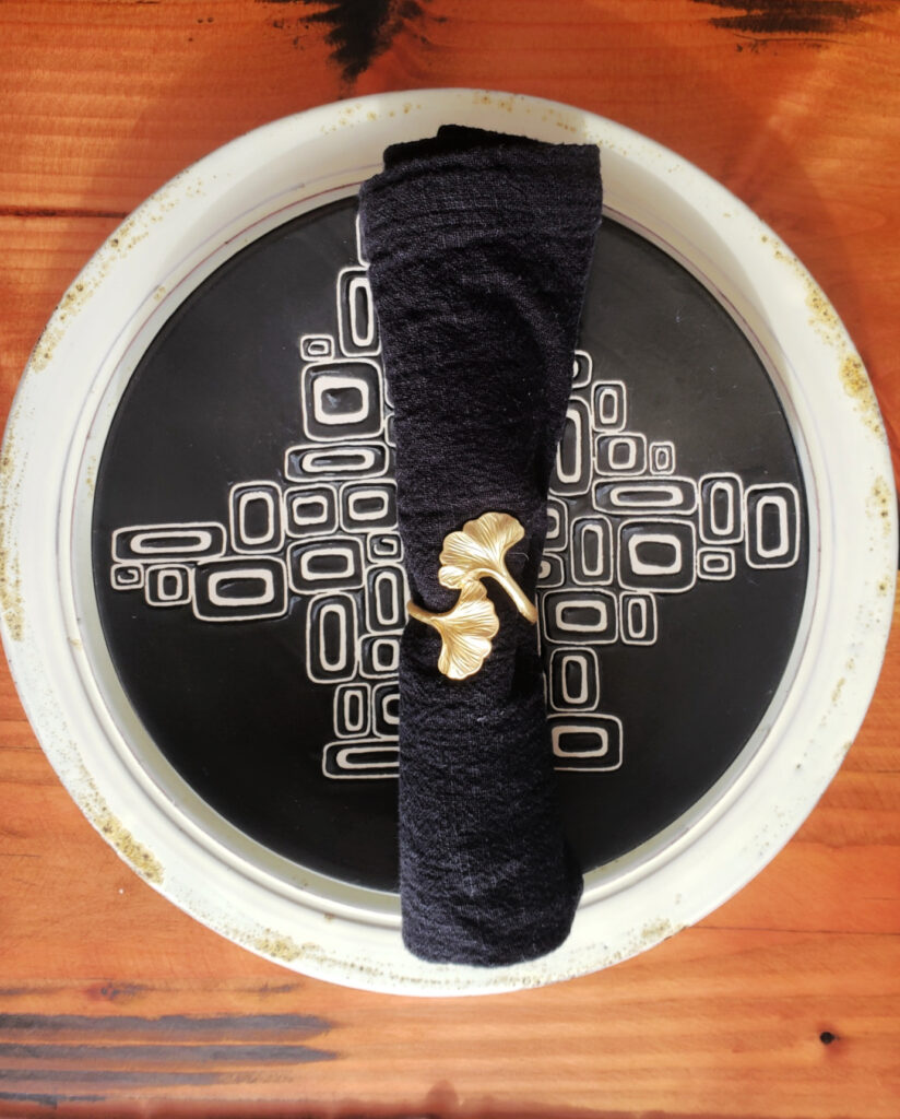 I used my white dishes I already had, the black and ivory salad plates were a Goodwill find and the pretty ginko leaf napkin rings are Amazon. The sputnik semi flush mount light also Amazon, how would I decorate without them?!