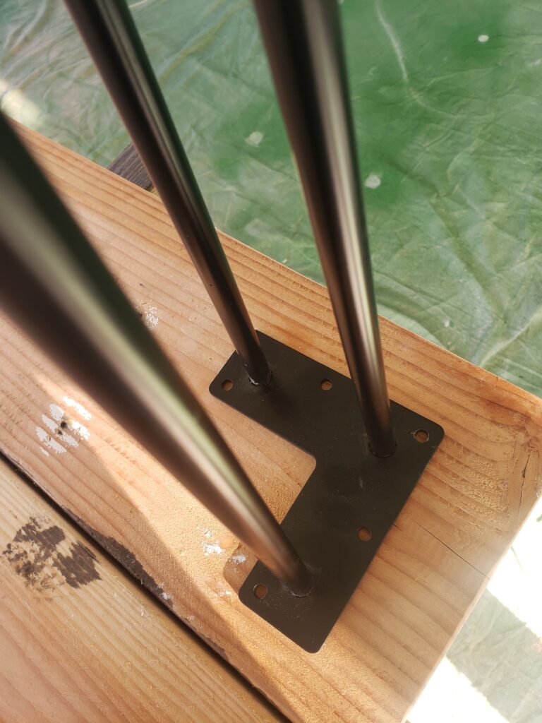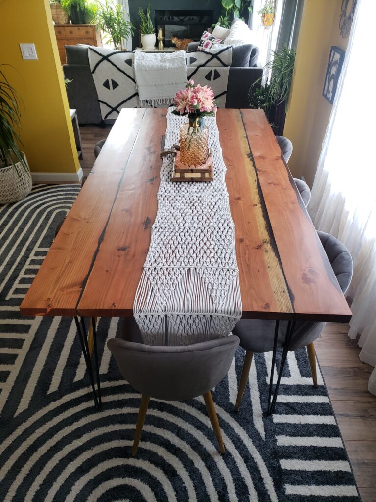 Before we stained and sealed the table once more we used a dark epoxy in the spaces between the fir boards. New hairpin legs and everything was really coming together. So excited!!
