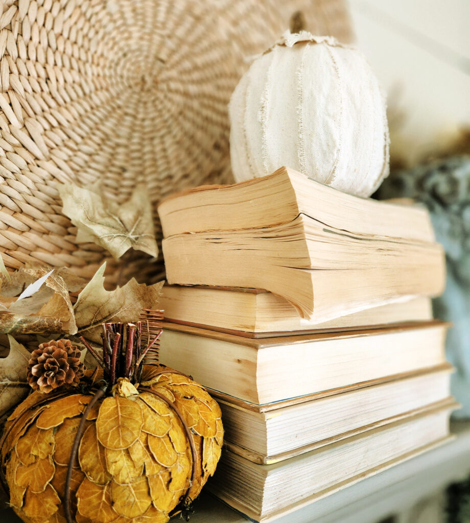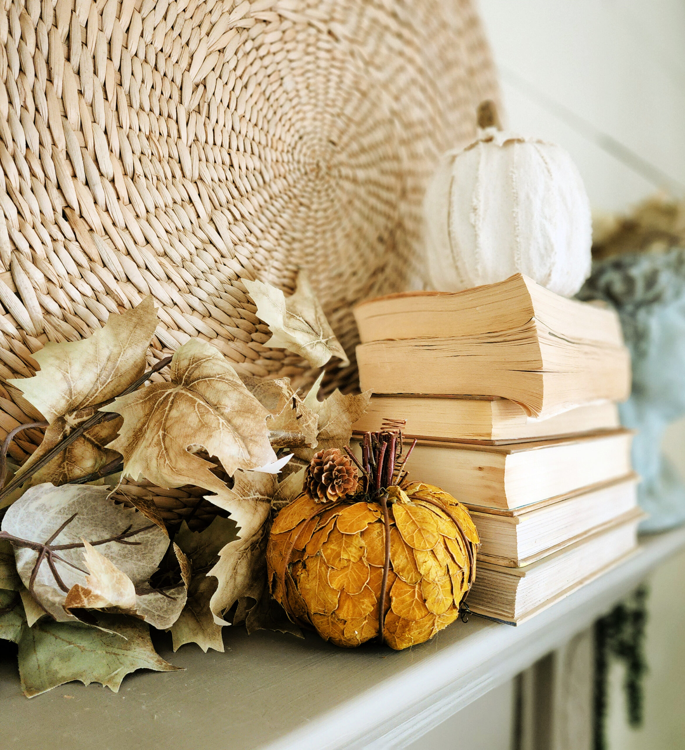 Bringing a few fall items I love out to make this grouping on our mantel was so fun. I chose soft, muted colors for the leaves and little pumpkins, leaning towards keeping it neutral and showing off the lovely book pages.