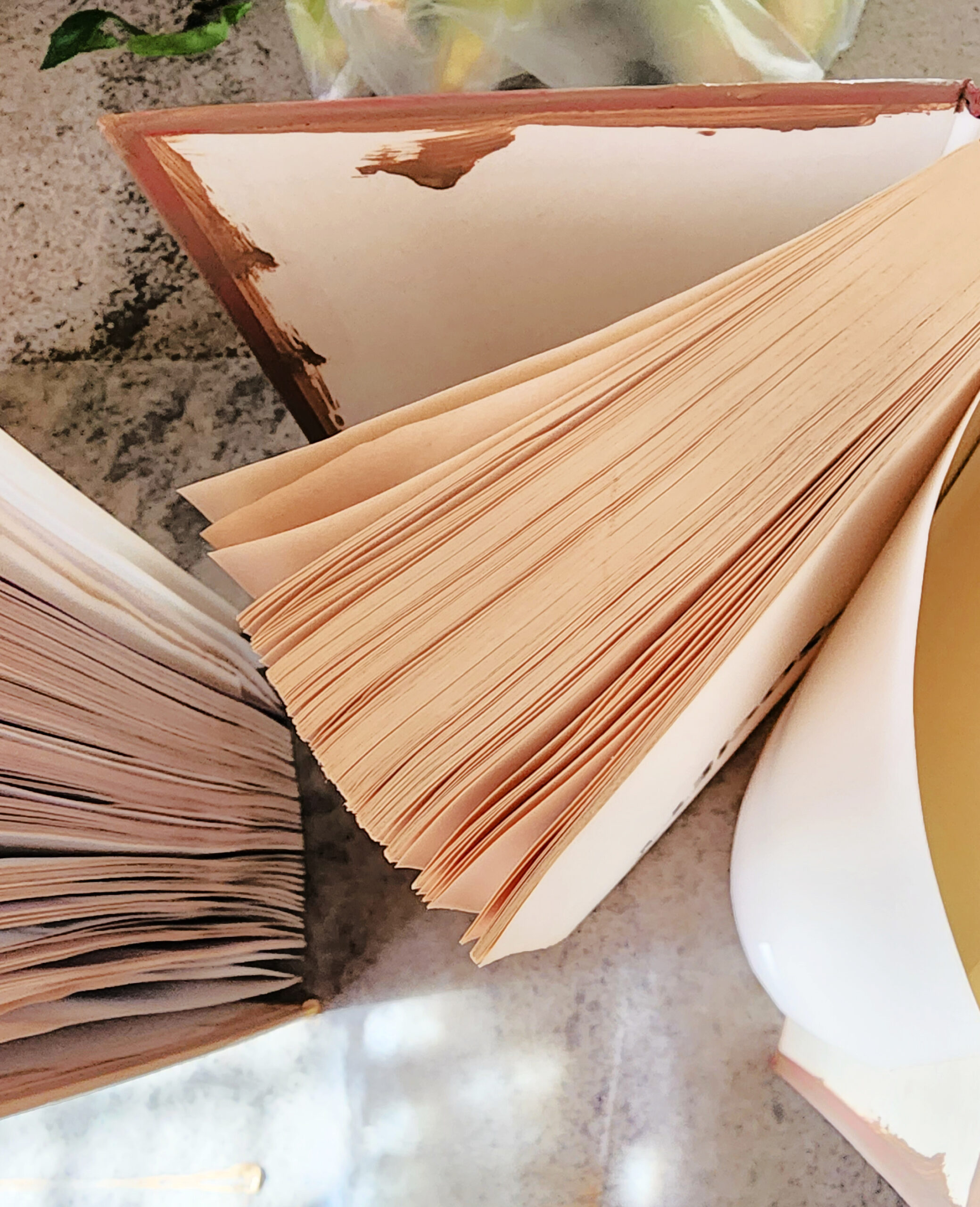 This is a super easy project that you can complete in a couple hours (only due to the dry time for the paint) but longer if you don’t have a warm place for the book pages to dry. It was over 100 degrees this week so boy did these dry fast.