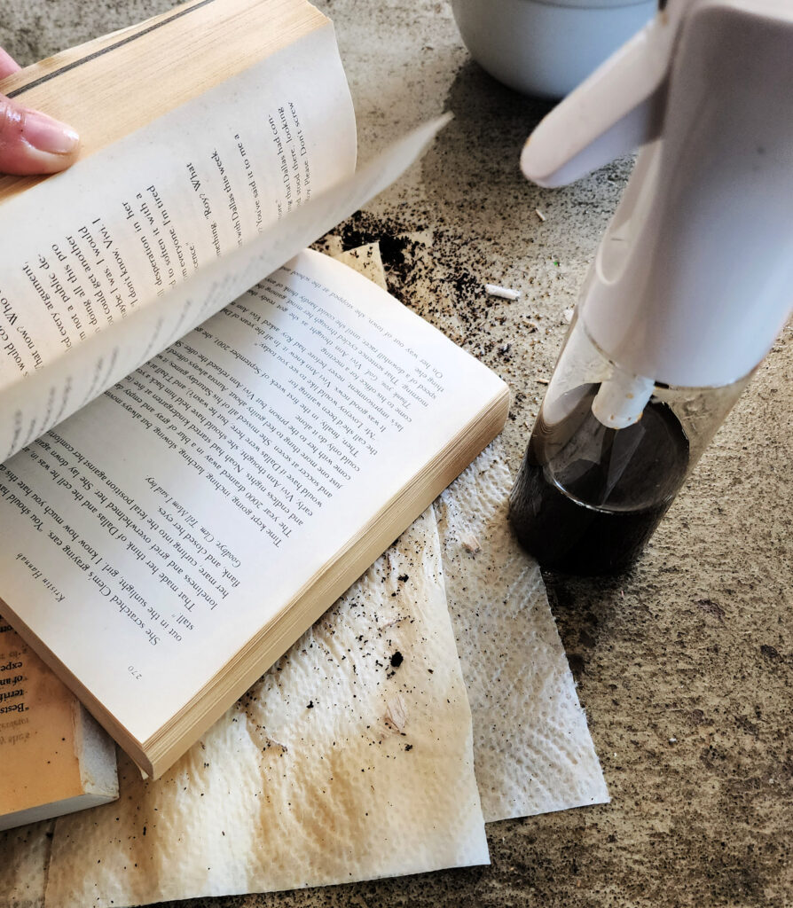 The only thing you really need is a thrifty source for books, acrylic paint, coffee, wax paper, foam brush and a spray bottle.