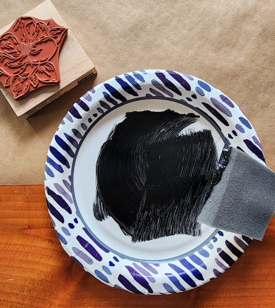 Next, I put some black acrylic paint on a small paper plate and each time I used the stamp I brushed a bit of paint over the stamp surface with a foam brush.