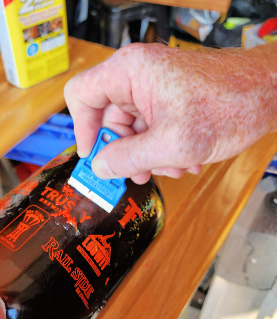 We used a scraper knife to remove the labels once the solvent had softened them. They came right off, and after a good washing in dish soap these beauties were drying in the sun.