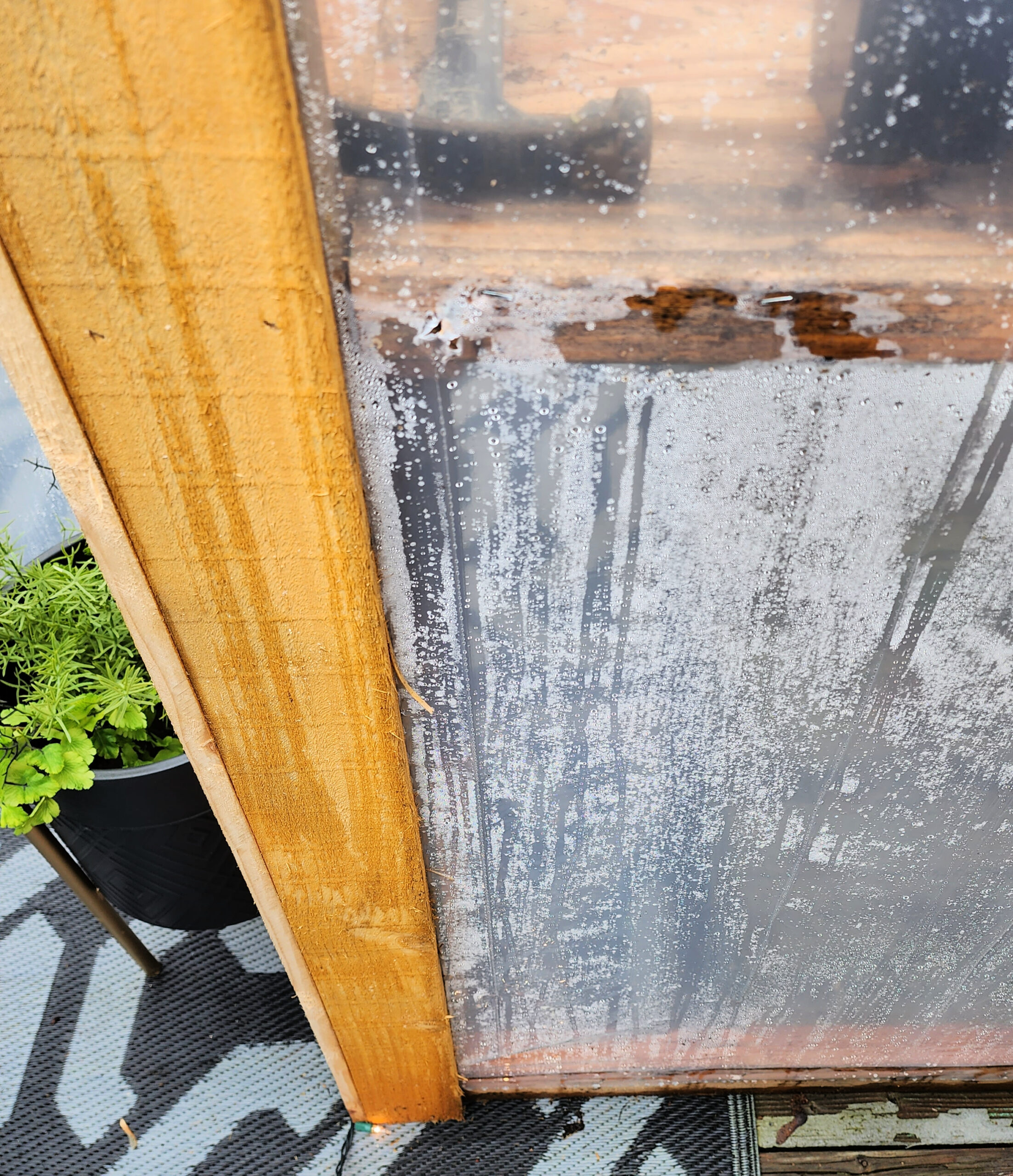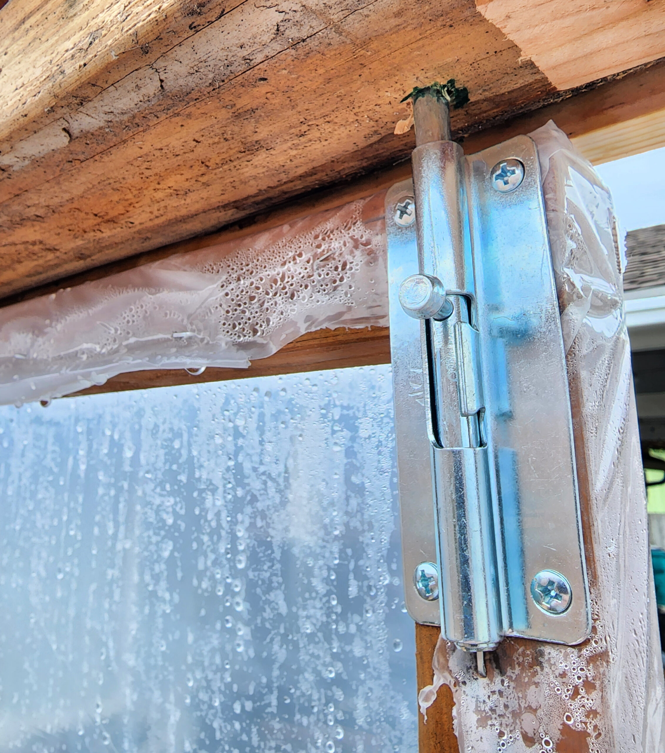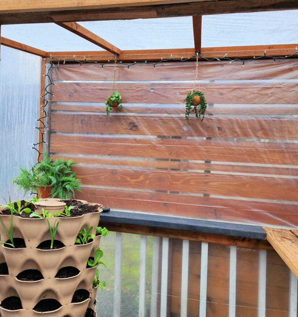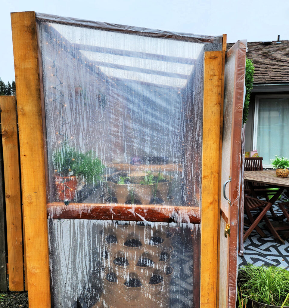 Once that was done we moved our tiered planter back in and added the handle and latches. It was amazing how quickly we noticed a difference in the temperature as well as the moisture that built up in the greenhouse right away.