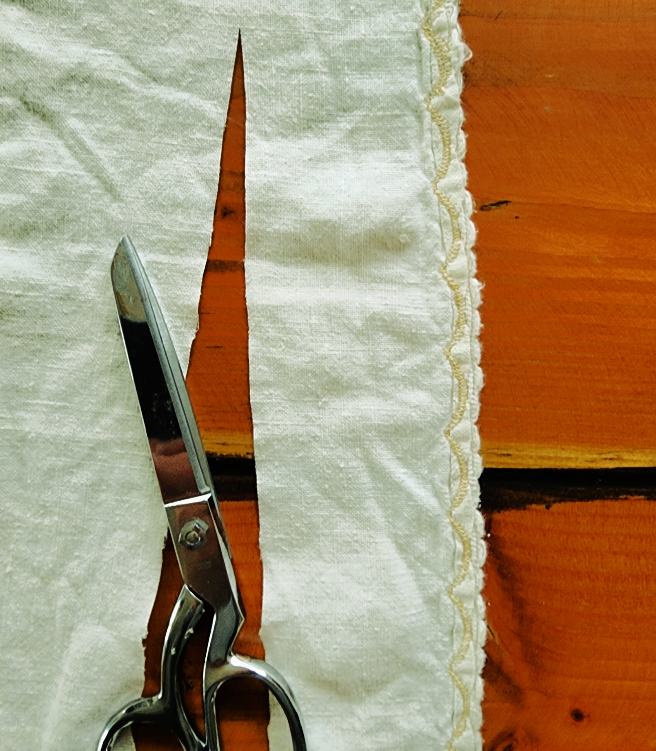 I measured the tablecloth and saw that by trimming about three inches all around the edges this would make it the same size as the lining blanket. This also gave me plenty of pre-hemmed ruffles for the ends.