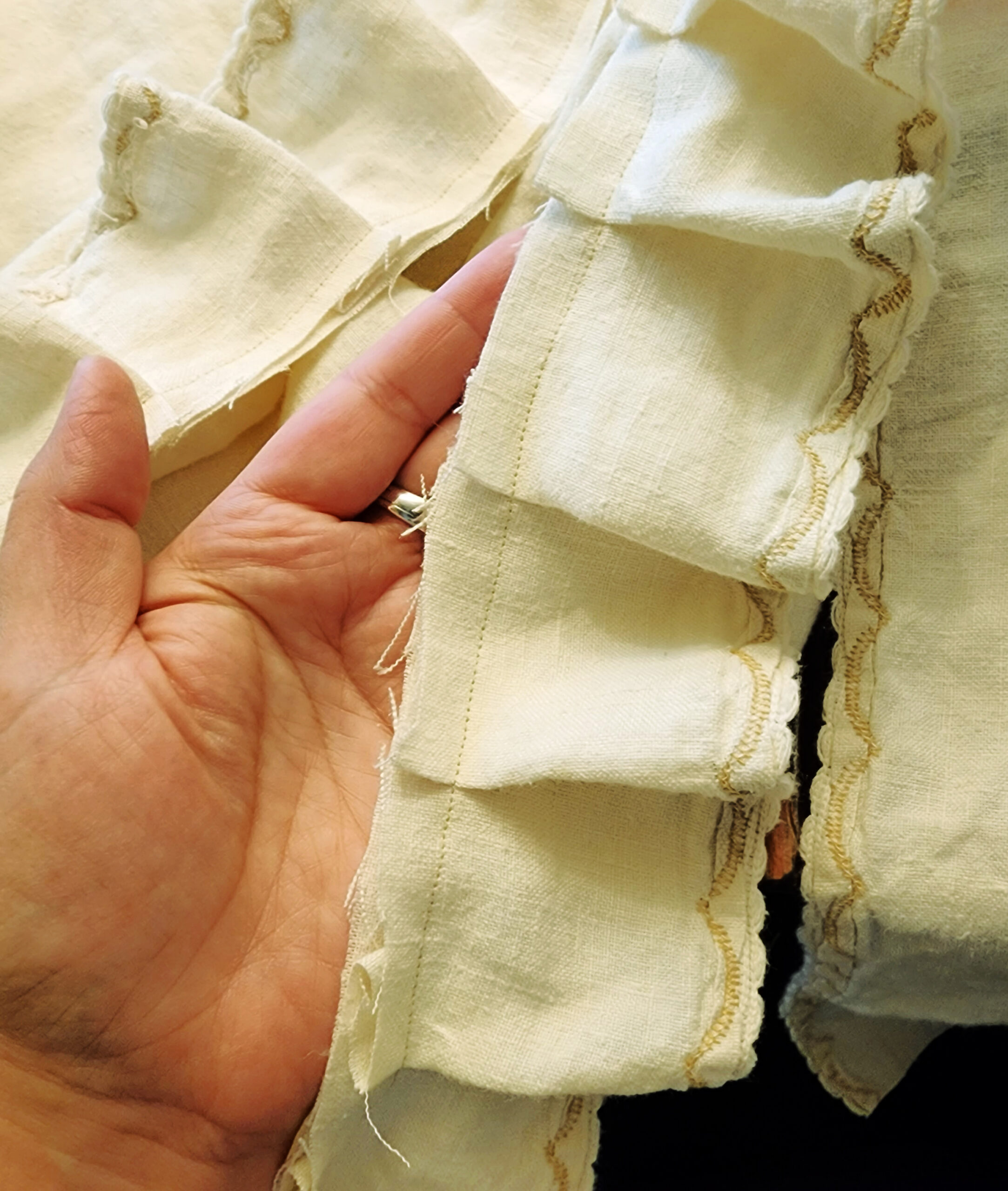 Once the pieces were cut and the same size, I created the ruffle by folding the part I trimmed off every few inches and making this super simple little pin tuck along each end of the linen front.