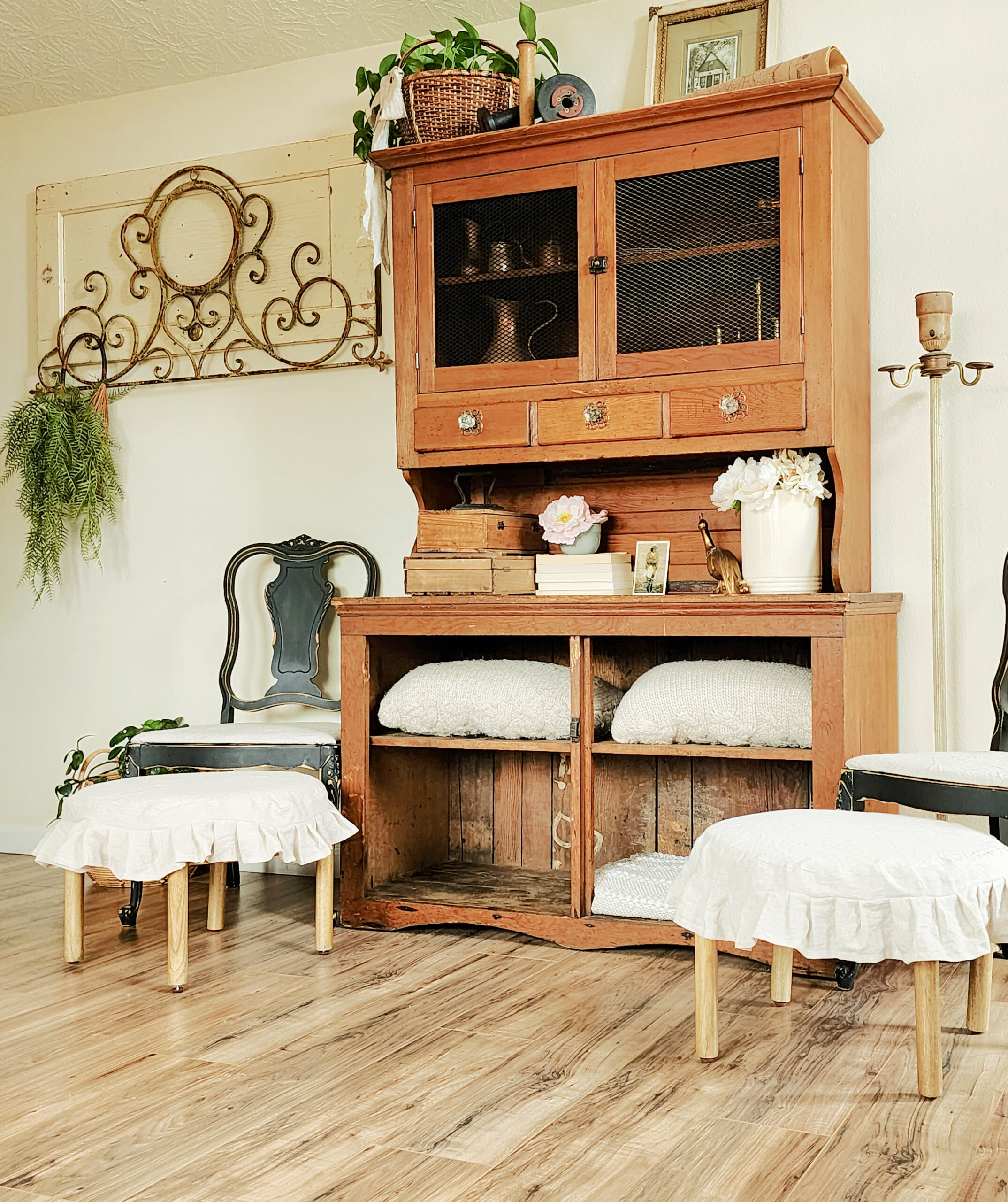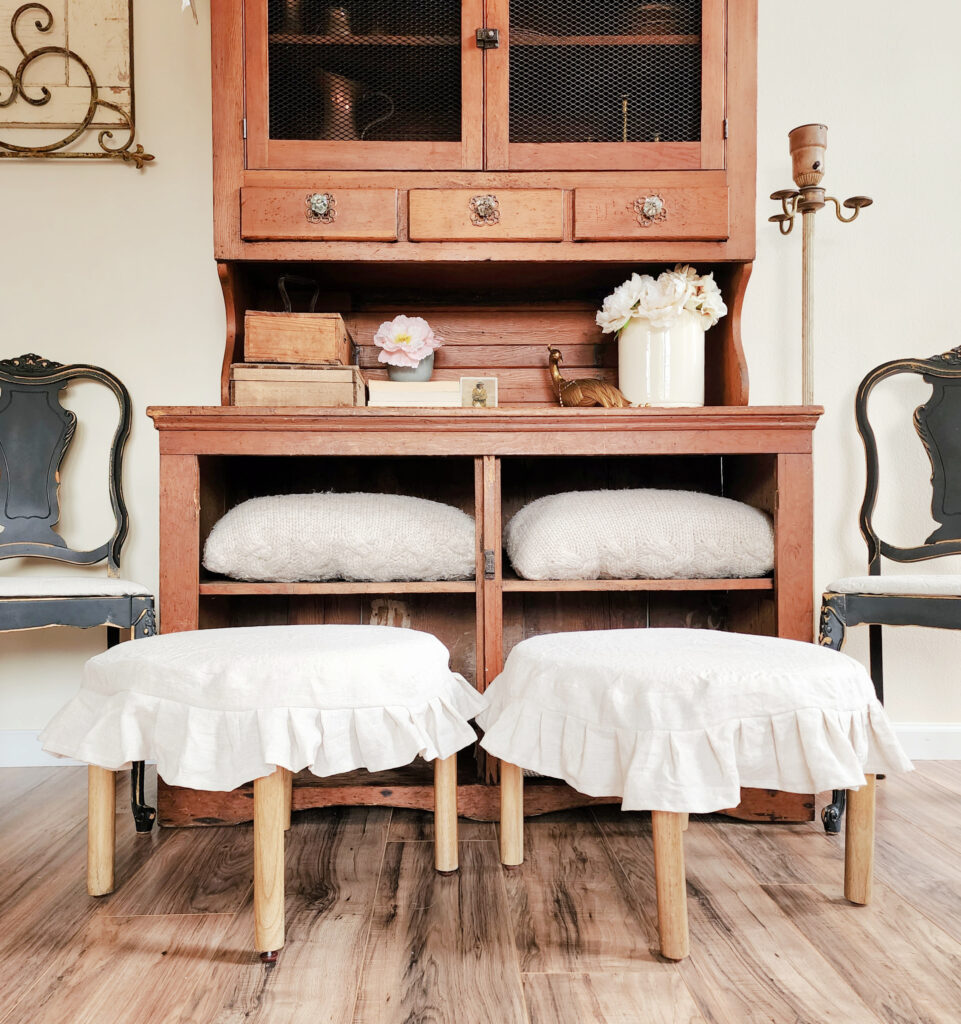 Ruffled linen DIY stool slipcovers + a new hutch