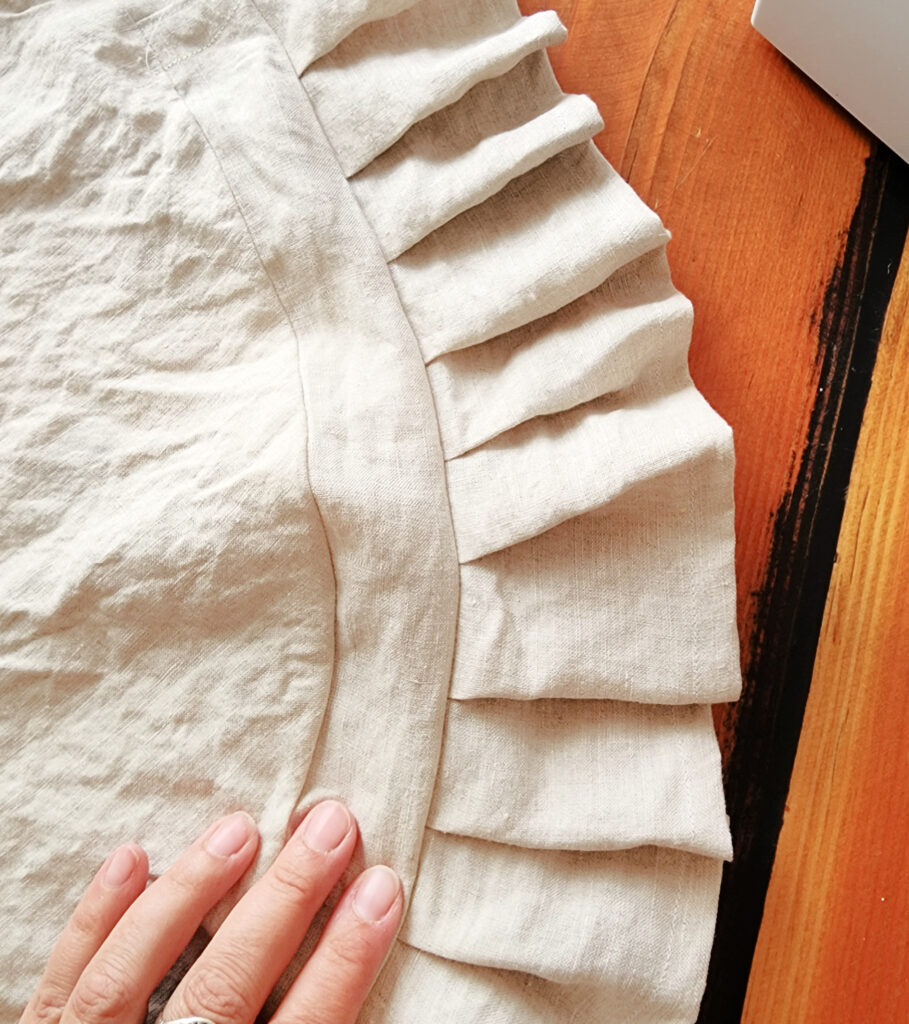 For the ruffle I doubled the amount I used for the flat side panel and cut the ruffle pieces 4″ wide instead of 2″ that I used for the side panel. Every inch and a half or so I pinched a small fold and sewed right over the top of it. By the time I got to the end and it was time to sew the side panel ends together and the ruffle ends there was just enough to fold in and stitch together.