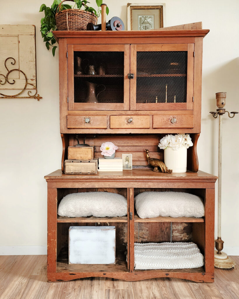 The bottom half has doors that were detached and I decided I would leave them off and just enjoy how pretty this 100+ year old hutch is.