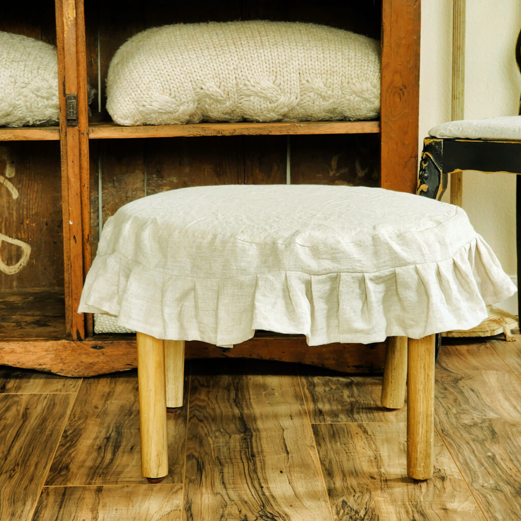 These were so quick to make and I love the cozy, warm, crumply look they bring to a simple footstool!