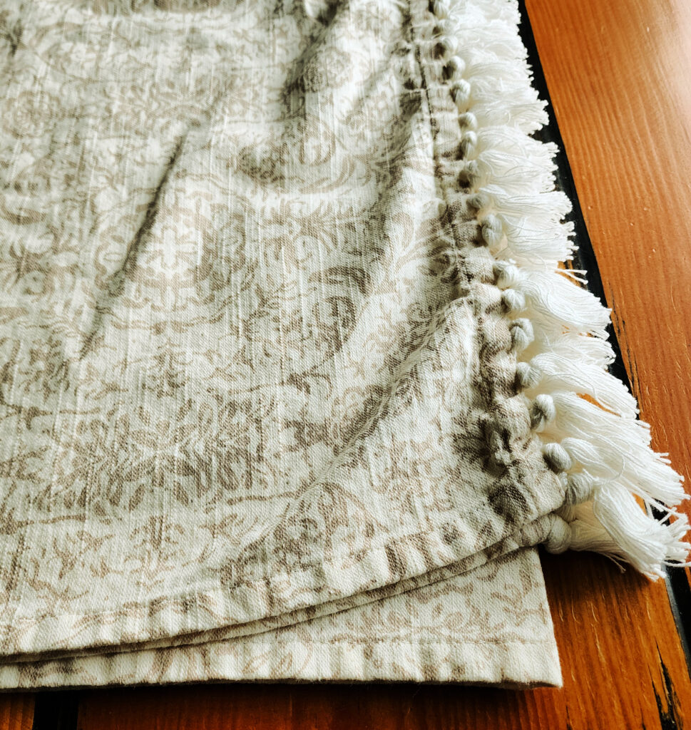 I have one more find that I was so excited about, a tablecloth that initially I thought would make great pillow covers. But when I unfolded it, seeing the pretty tassels and quality of the fabric, I decided it would go in our dining room for Spring. That space coming sooner that I got this one out hopefully!