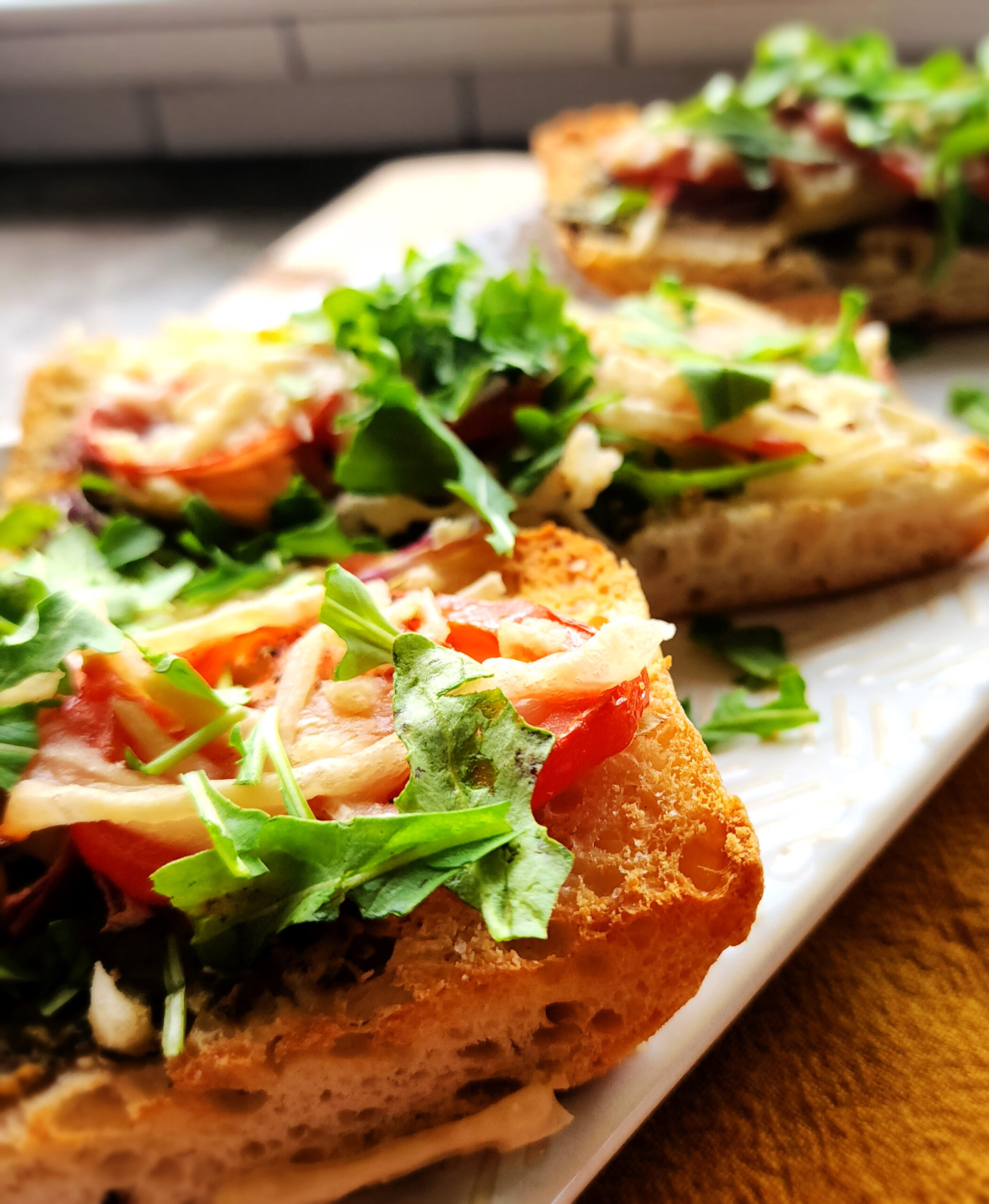 I cut the focaccia in half, and lengthwise so it made 6 nice sized pieces. Using my favorite homemade pesto recipe you can find here- Minimalist Baker, she is wonderful. I use walnuts and much less water than the recipe calls for since I like the pesto to be fairly thick for meals like this. Spread the pesto generously on the focaccia, add cut up artichokes (canned in water) red onion, sliced roma tomatoes, and a sprinkle of vegan mozz over the top. Using my air fryer on the air fry setting, I toasted the bread and sprinkled a handful of cut up arugula when they were toasty and the cheese was melting.
